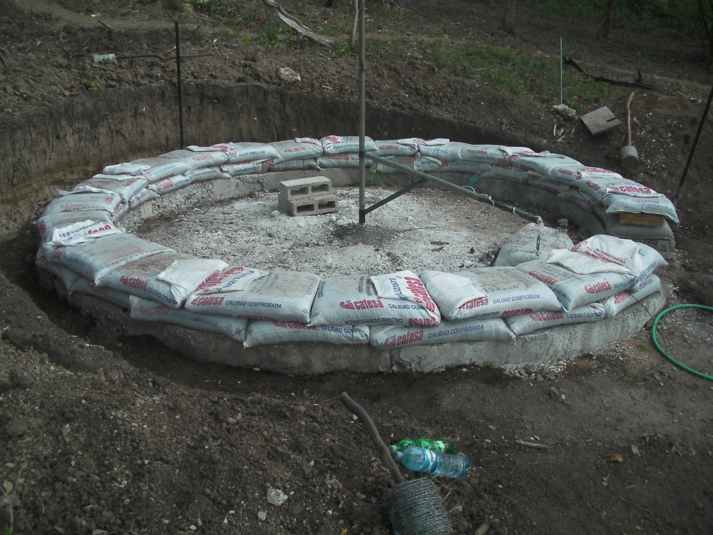 For the grade beam we chose Construction Lime as that is more economic and much better for the environment than cement. The bags were donated by a neighbor and filled with the dirt removed from same location mixed with the river sand. The compass was made from 2 metal poles already on site (one was from the container door) and welded by a neighbor for $40.
